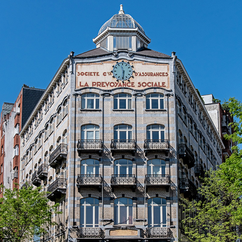 On 25 September 1907, following a congress of the Belgian Workers’ Party (POB) in 1906, Social Security was created. Thanks to the support of the Union du Crédit and the Banque Nationale, the organisation was able to take off again in 1912. To mark this turning point, it commissioned architect Richard Pringiers, a disciple of Victor Horta, to draw up plans for a new building to house its services. In 1913, the head office moved to Square de l’Aviation in Anderlecht, to a building in the late Art Nouveau style. In 1919, the company had to manage the creation of SMAP, and its profits continued to grow, so much so that in 1930, it entrusted architects Fernand and Maxime Brunfaut with the rationalisation and refitting of its premises. While the duo preserved the ensemble without altering it, they also created one of the most successful interiors of the period, blending Art Deco and modernism. The large hall, with its flowing curves, is richly decorated with veined white marble, green granite, blue mosaics and numerous chrome elements. Once through the vestibule-porch, you enter the space enclosed by a continuous counter. The mezzanine floor was converted into a mezzanine and housed staff offices. Others, on the upper floor, were intended for executives and were carefully panelled with rosewood, walnut, light birch and mahogany. Deserted by the Prévoyance Sociale in 1957, and after an extensive restoration, the building now houses the CEGESOMA or The Study and Documentation Centre for War and Contemporary Society. Both services are part of the State Archives. (CL 09/09/1993)