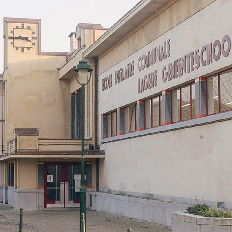 At the instigation of the Foyer Anderlechtois, the garden city of La Roue was built in 1921 under the direction of architect Jean-Jules Eggericx. The Art Deco-style complex was built by urban planner Louis Van der Swaelmen, who drew inspiration for the design of the semi-detached houses from English landscape architecture. It was decided to equip the city with a mixed primary school under the management of the municipal authorities. The plans were entrusted to architect Henri Wildenblanck, who designed an alternating sequence of protruding spaces and successive recesses, a magnificent combination of masses strictly defined by modernist geometry. In addition to classrooms, the school included two courtyards, a function room (which also served as a gymnasium), a caretaker’s office, public showers and a playground. The cement-coated concrete frame rests on a bluestone base, and the windows are decorated with predominantly black glazed tiles. These modernist influences with a touch of Art Deco can also be found in the interior, which has been meticulously crafted using quality materials such as marble and Congolese wood. An admirable glass roof by Fernand Crickx featuring children at play adorns the courtyard, which is dominated by an imposing Art Deco-style chandelier. (CL 14/02/2008)