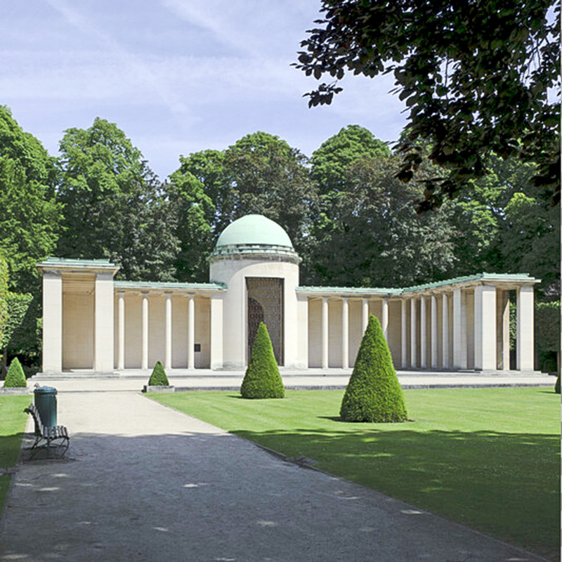 Originally designed by architect Charles Girault, creator of the Cinquantenaire colonnade and the Tervueren Museum, Square du 21 juillet faces Notre-Dame de Laeken church and appears to be an extension of the royal estate. It was King Leopold II who ensured its development. In 1905, the existing slums were demolished and Rue des Vignes widened. In the 1930s, the square underwent a number of modifications, designed by René Pechère, and was endowed with a monument dedicated to Queen Astrid, proposed by architect Paul Bonduelle. Two colonnades converge on a central, open rotunda housing a full-length statue of the sovereign sculpted by Jan Boedts. The sovereign’s cypher, a stylised double A topped by a crown and decorated with ribbons and roses, enhances the coffered ceilings of the U-shaped colonnades. Classicist in style, this monument to monumental academicism illustrates one of the contemporary currents of Art Deco proper. The complex was inaugurated on 21 July 1938 and has retained its name ever since.