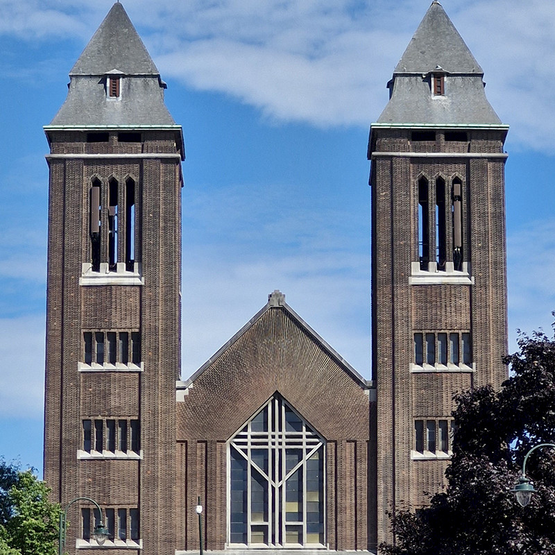 Geographically, Saints-Pierre-et-Paul church was built between the disused Saint-Nicolas church and Saint-Pierre church, of which only the Romanesque tower remains. At the request of the Archbishop’s palace, two powerful towers were added to the facade to commemorate these two monuments to the municipality’s history. Architect Henri-Julien De Ridder designed this powerful building, which rose from the ground in 1935. Modernist in style, it features references to the past, such as the churches of the Mosan region with their two mighty bell towers on the facade. In this case, the reinforced concrete structure is clad in brick, while the interior is covered in plaster. Ample barrel vaulting punctuates the entire width of the single nave. The astonishing clerestory bas-reliefs, like the one on the tympanum of the main entrance, are the work of Paul Stoffijn.