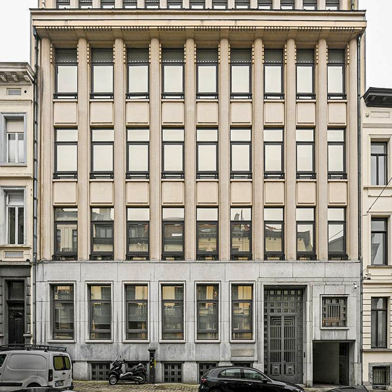 At the request of the Empain Group, architect Antoine Courtens drew up plans for a new building to house Electrorail’s headquarters. A pupil of Victor Horta, he had already designed the Palais de la Folle Chanson, as well as the Hôtel Haerens, which was under construction when work began on Rue de l’Association, two fine examples of the Art Deco style in Brussels. He naturally turned to his architectural background to design the facade, whose ground floor of small granite is pierced by six high bays with bush-hammered stone frames. It supports three storeys of white stone, punctuated by ten colossal engaged columns whose fluting emphasises the building’s vertical momentum; the whole is crowned by a projecting cornice topped by an attic with thirteen bays, each pierced by a window. One opening, over the garage door, and the front entrance, have retained their hammered wrought-iron decoration, typical of Art Deco. Formerly occupied by the European Bank for Latin America, the building now houses a law firm.