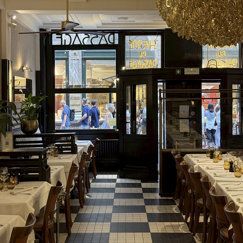 In the first section of the Galeries Royales Saint-Hubert, from Rue du Marché aux Herbes to Rue des Bouchers, nestles one of Brussels’ best-known addresses. Architect Jean-Pierre Cluysenaer had reserved the site for a restaurant. His wish was granted with the opening of the Taverne du Passage, a café frequented by the Surrealists, which then became one of the capital’s most popular eateries. The contrast is evident when you leave the elegant decor of the galleries to find yourself, once through the door, in this Art Deco cocoon designed by architect Léon Govaerts in 1926 and adapted by Alexis Van Vaerenbergh ten years later. The wood-panelled walls, typical integrated lighting and period furniture were all preserved during the recent renovation, completed in 2022, which restored the soon-to-be century-old establishment to its former glory. A hanging of golden origami, designed by Charles Kaisin, now adorns the main room.