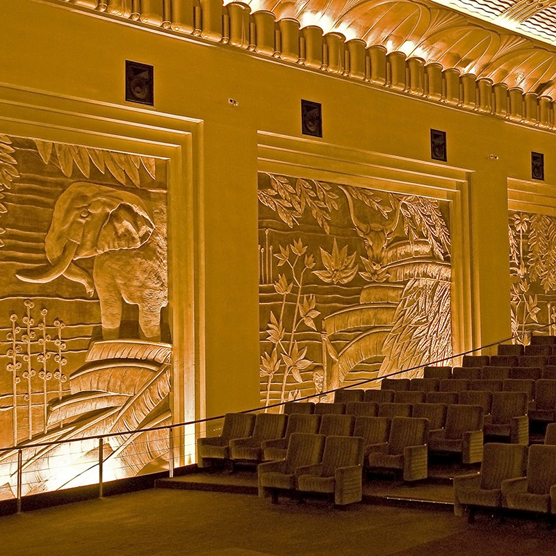 Belgians seem to have been particularly receptive to the art of filmmaking, since it was in Brussels, in 1895, that the Lumière brothers chose to present their first official screening, six months after the historic Lyon showing. Since that time, the city centre has become a meeting place for movie buffs, as evidenced by the construction of the Eldorado cinema in 1931-1932, designed by architect Marcel Chabot. Chabot showed a preference for Art Deco and designed an impressive hall with a capacity of 3,000 spectators. The expansion of the complex between 1974 and 1978 irreparably affected this space, with the lower section cut off. However, the upper part was preserved, and today’s large cinema still boasts a remarkable colonial-inspired décor. Comprising a succession of gilded reliefs by sculptors Wolf and Van Neste, it illustrates daily life in the Congo in the 1930s, with a special focus on flora and fauna. Today, the hall can accommodate 708 spectators, who are more than happy to enjoy this unique setting. (CL 28/04/1994)