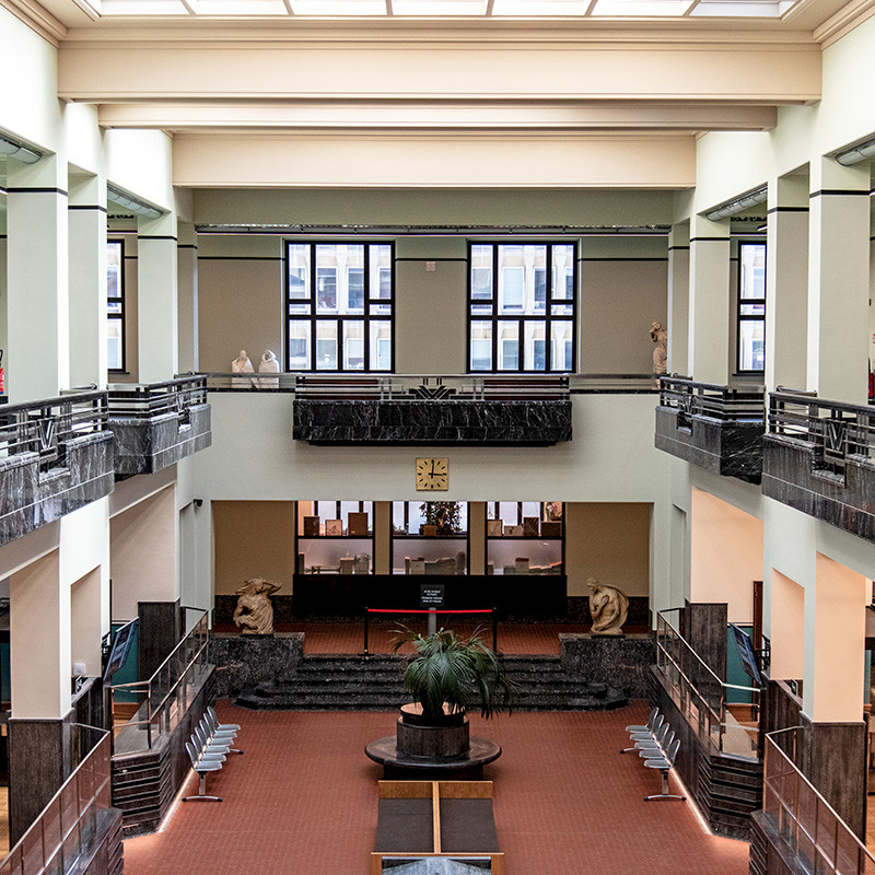 After experimenting with Art Nouveau, after the First World War Jean-Baptiste Dewin adopted a style influenced by Art Deco and the International School. He put his knowledge into practice on the new Forest Town Hall, which he designed in 1925. However, it was not until 1934 that work could begin. A 50 m-high belfry towers over a massive building of yellow brick, bluestone and concrete, the preferred materials of the period. The tower is adorned with a clock and four sculpted bronze groups symbolising municipal rights. Restored to their former glory, they are again shining brightly since the town hall recently underwent a major restoration. Dewin’s architecture was functional and logical, but not without a certain luxury, as exotic woods (avodire, ebony, bubinga, iroko kambala) and polished marble form the basis of the interior decor. Inaugurated in 1938, the town hall features a vast two-storey office under a zenithal glass roof, as well as a large hall with a grand staircase, with facings combining white Carrara marble, blue Bioul marble and black Mazy marble, a beautiful ensemble complemented by stained glass windows and wrought ironwork (listed 10/22/1992).