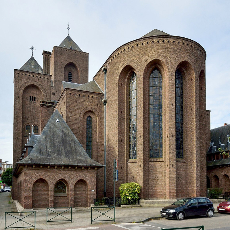 Entirely decked out in pinkish-grey "Klampsteen" bricks, St. Adrian’s Church, consecrated in 1941, was built not far from an eponymous chapel that had existed since the 15th century. Construction began in 1938, and was entrusted to architect Auguste Vanden Nieuwenborg, who had to work within the constraints of a limited budget. He drew up plans for a massive church with clearly defined spaces connected around the central nave. He skilfully fused the Art Deco style in vogue at the time with Romanesque reminiscences. Brick arches, adapted from Romanesque Lombardy, skilfully highlight all the building’s openings. It is the reliefs and the play of light and shadow they create that make the decorative statement. The architect chose to integrate the powerful bell tower into the main facade, no doubt inspired by some of the hall churches of northern Europe and solutions that already existed in the Mosan and Rhenish regions in the Romanesque period. The central portal is set in a pronounced recess which, by extending, emphasises the vertical momentum of the bell tower. Inside, the pillars and vaults are covered in sandy-yellow brick. You can also admire the seven stained-glass windows created by designer Danieli in the 1960s.