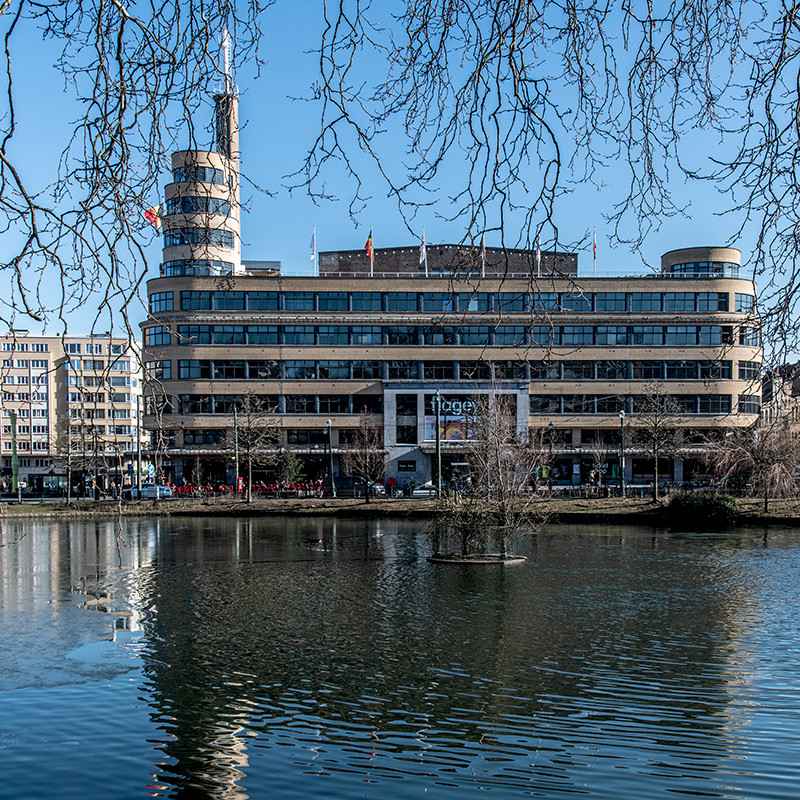 In 1933, Joseph Diongre won the competition to design the new home of the National Institute of Radio Broadcasting. He worked with different engineers to meet the technical requirements of the future buildings. One of them, Raymond Braillard, was responsible for the large corner turret. The modernist-style building was also inspired by the International style in vogue in the Netherlands at the time, while its Streamline Moderne silhouette and interior decor are tacitly reminiscent of Art Deco. Diongre, who blended bluestone with Foucquemberg yellow-ochre sandstone brick, endowed each floor with continuous glazing in the entablature, thus endorsing its horizontal approach. He designed rounded corners to soften the building’s imposing appearance. Work began in 1933 and was completed in 1938. The seven-storey building on the Place Flagey side, with six storeys on the Place Sainte-Croix side, had a powerful foundation of 836 concrete piles anchored into the ground. There are no fewer than twelve recording studios, including the famous Studio 4 with its 8,000-pipe organ. The astonishing acoustic qualities are complemented by the meticulous finish of a décor based on the extensive use of wood. The complex was put up for sale, and bought in 1998 by the limited company Maison de la Radio Flagey. It was fully restored. Today, Flagey is home to a unique audiovisual hub in Brussels, offering studios, concert halls, cinemas, offices and restaurants/bars. It proposes festivals and a rich programme of classical music, jazz and cinema. (CL 28/04/1994)