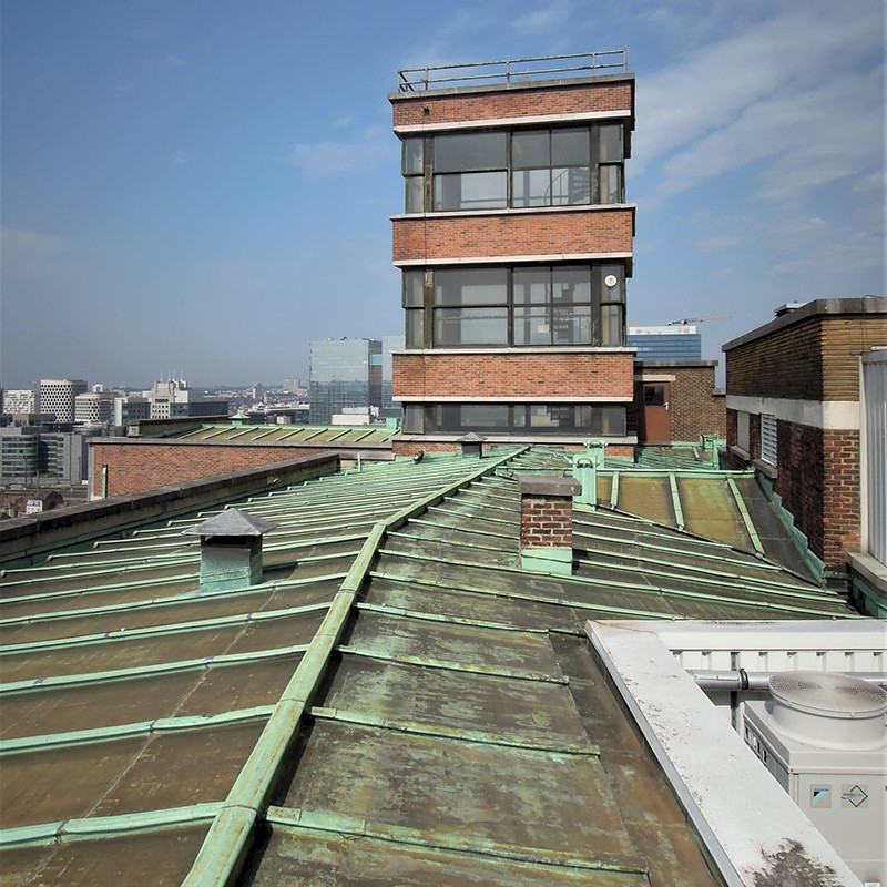 In Belgium, the first telephone line was installed in Parliament in 1879. It was not long before a number of private entrepreneurs saw the potential of this new sector and filed applications for operations all over the country. In 1896, however, a public utility company was set up to prevent abuse. The telephone was a great success, but the First World War brought its expansion to a halt. Finally, the Régie des Télégraphes et des Téléphones was created in 1930, and the number of subscribers continued to grow, to the point where the company, now known as RTT, was allocated a new building for its administrative services, commissioned by the Belgian government in 1935 from architect Michel Polak. Already responsible for plans for the Résidence Palace and the Villa Empain, this graduate of Zurich’s École Polytechnique delivered an imposing modernist-style building with facades clad in blue and white stone at the front, and yellow and red brick at the back and sides. Window valances punctuate each floor, a horizontality that is not broken by the two observation turrets at the top, which were used at the time to study parasites. After the Second World War, the building was doubled in size, bringing the number of experimental turrets to four. The building’s interior has been meticulously preserved, as evidenced by its beautifully laid-out corridors, elegant sliding windows and high-quality metal elements, from stair railings to ornamental ironwork.