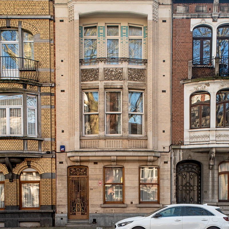 This remarkable Art Deco bourgeois house was built for a Portuguese merchant, Mr Homem de Macédo. It has kept its name ever since. Architect Émile Vanlerberghe was in charge of the project, which was completed in 1927. The date and the signature of the owner appear on the ground floor, which was clad in white stone. On the upper floors, white Silesian bricks were combined with white and light-blue stone and glazed bricks, a colour also found on the imposing cornice. The facade features a central bow window topped by a loggia with a balcony decorated with stylised floral motifs. The house has retained a splendid glass door with a wrought-iron gate featuring a gushing fountain. A butterfly serves as a doorbell. The interior perfectly illustrates the volumetry typical of the period and the decoration, a refined Art Deco style reflected in the fireplaces, stained glass windows, radiator covers, locks, doors, hardware, wood panelling and choice of marble. (CL 23/12/2021)