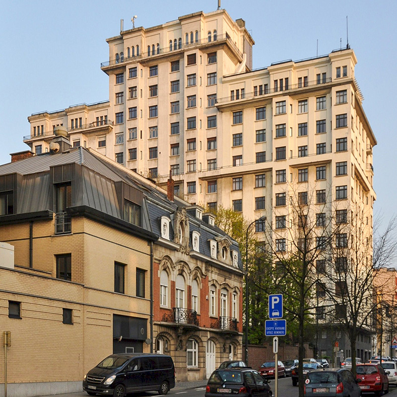 This major complex of Art Deco buildings was commissioned by developers Lucien and Gérard Kaisin. The first, founder of Crédit Général Hypothécaire, was behind the construction of the Résidence Palace. The project was entrusted to architect Marcel Peeters, and the building was erected between 1930 and 1934. The U-shaped complex features a ground floor and mezzanine in polished black granite. While the street- and garden-side facades have been given a Tyrolean rendering, the others feature cemented concrete, with Boom brick infills, all concealing a Hennebique-type reinforced concrete framework. Comprising fifteen floors at its highest point, the building offered the wealthy bourgeoisie apartments with every comfort, including communal services (restaurant, shop, solarium, reception room allowing residents to entertain without having to use their private space). The three entrance halls are clad in light oak mouldings and feature mosaic floors. Both the lift and the original wooden staircase have been preserved in the right-hand unit. The staircases in the other two units are made of granito. A garden completed the ensemble. (CL 19/04/2007)