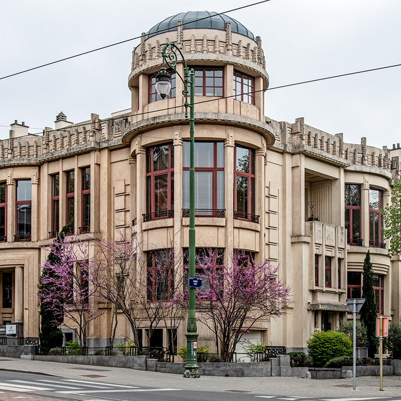 1928 marked a high point in the career of Antoine Courtens, who had to take on two major projects: the Palais de la Folle Chanson, not far from the Abbaye de la Cambre, and the Hôtel Haerens. To best fit the plot, the architect designed a corner building with a rotunda tower at the connection point; this tower acts as a sort of junction between the lower part, a tenement house overlooking Avenue de la Ramée, and the upper part, a city dwelling adapted to society life. The resolutely geometric shapes, white facades and elegantly understated stylised decor place the building in the purest Art Deco style. Courtens’ way of conceiving things was undoubtedly inspired by Victor Horta, whom he trained with. It also borrows certain elements from Frank Lloyd Wright, such as the architectural frieze concealing the flat roof. Particular attention was paid to the interior design, especially the large entrance hall, which was finished in high-quality marble. The floor features alternating triangular elements in black marble and veined marble, the latter also used for the base and treads of the staircase (CL 08/08/1988).