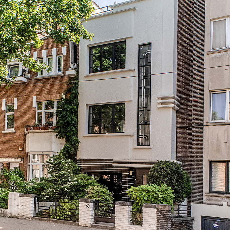 With the exception of his first known Beaux-Arts-style building in Laeken, dating from 1922, and a neo-Gothic-inspired building in Jette from 1927, Louis Tenaerts’ career was marked by Art Deco, with occasional Viennese Secession inspiration and strong Streamline Moderne tendencies. His collaboration with CIB (Comptoir Immobilier Belge) in the early 1930s expanded his production. It was in this context that he was asked to work on Avenue Coghen. In 1934, he built this house, which rises vertically from a narrow plot of land. The high, stained-glass window, topped by a cubic space on the third floor, which gives access to the terrace, further enhances this approach. The house has a black brick base with white pointing, the two tones chosen by Tenaerts for this facade, as for many other houses in the district.