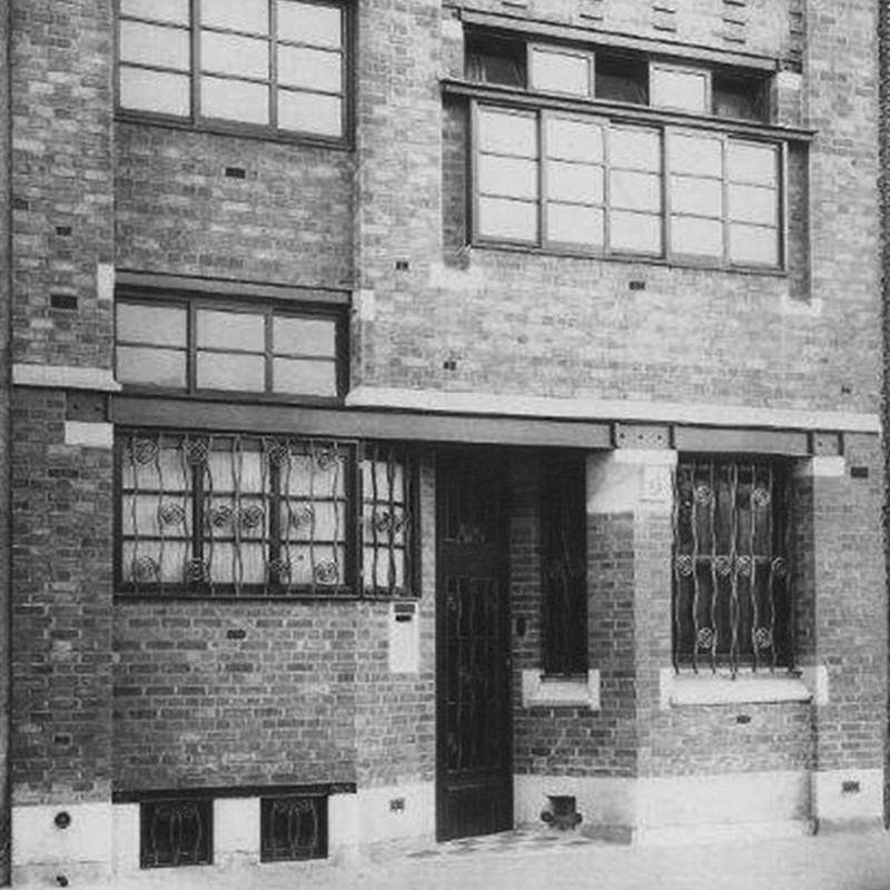 In 1910, architect Antoine Pompe drew up plans for Doctor Van Neck’s clinic, a veritable manifesto of rationalism. He then went into partnership with Fernand Bodson, another architect, until 1921, participating in the construction of garden cities. In 1922, he designed the cottage-style Vandevelde house in Ganshoren, a modernist-style house on Rue des Atrébates, and this house in Woluwe-Saint-Lambert, whose brick facade somewhat mirrors the internal structure he had designed. Antoine Pompe designed an oblique entrance that announces the non-orthogonal treatment of the spaces, as do the non-symmetrical windows of different sizes that suggest half-levels; this was a way of making the most of the spaces organised around the stairwell. The masonry work gives a rhythm to the whole structure, crowned by two chimneys, also placed at an angle. (CL 22/09/2016)