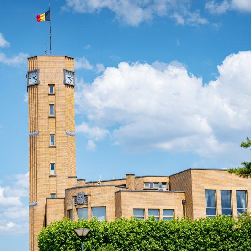 Erected in the heart of the municipality, Woluwe-Saint-Lambert town hall is the work of architect Joseph Diongre, one of the leading exponents of a style somewhere between Art Deco and Modernism, and the creator of numerous landmarks in Brussels. Inaugurated in 1939, the modernist-style building combines small granite and yellow Boom brick. It features a 30 m-high polygonal belfry tower. The interior space is organised around the concourse, with its hushed, monumental ambience, an exceptional gathering place. When you enter the building, you will have an unobstructed view of the counters and the upper floor of the building, thanks to the passageway encircling the rotunda, all naturally lit by the openwork dome. Some rooms have parquet flooring and wood panelling, while the stairwells are adorned with marble. As befits its function, every day it welcomes a large number of constituents seeking documents and information. (CL - 13/04/1995)