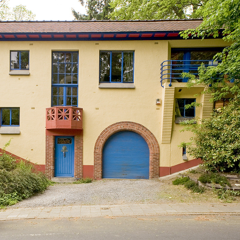 Een jaar voordat hij het gebouw van de Geneeskundige Stichting Koningin Elisabeth in Jette ontwierp, liet architect Henry Lacoste dit huis bouwen en ging er zelf in wonen. We schrijven 1926 en hij koos voor een nogal eclectische art-decostijl, waarin hij modernisme en de scheepsstijl combineerde met mediterrane elementen die voortkwamen uit zijn interesse in de beschavingen van de Oudheid. Het heeft een asymmetrische gevel met gevelopeningen in verschillende vormen, waaronder een vijfzijdige erker op de linkerhoek. Lacoste aarzelde niet om kleuren te combineren en koos voor een elektrisch blauw voor de metalen kroonlijsten, de reling van het balkon, de toegangsdeur en de garagedeur, geel voor de bepleistering op de muren en okerbruin voor de kroonlijst en de onderbouw, dat past bij het donkerrood van de bakstenen in de deurkozijnen en tussen de drie vensters op de benedenverdieping. (Beschermd 22/11/2012)
